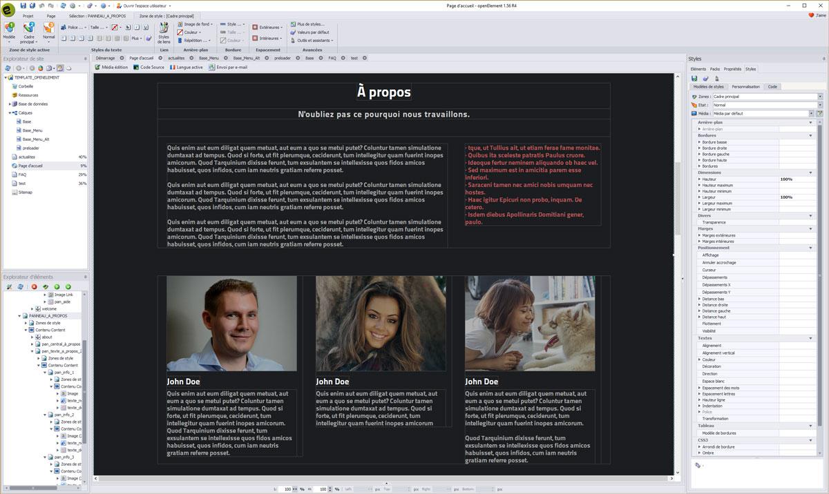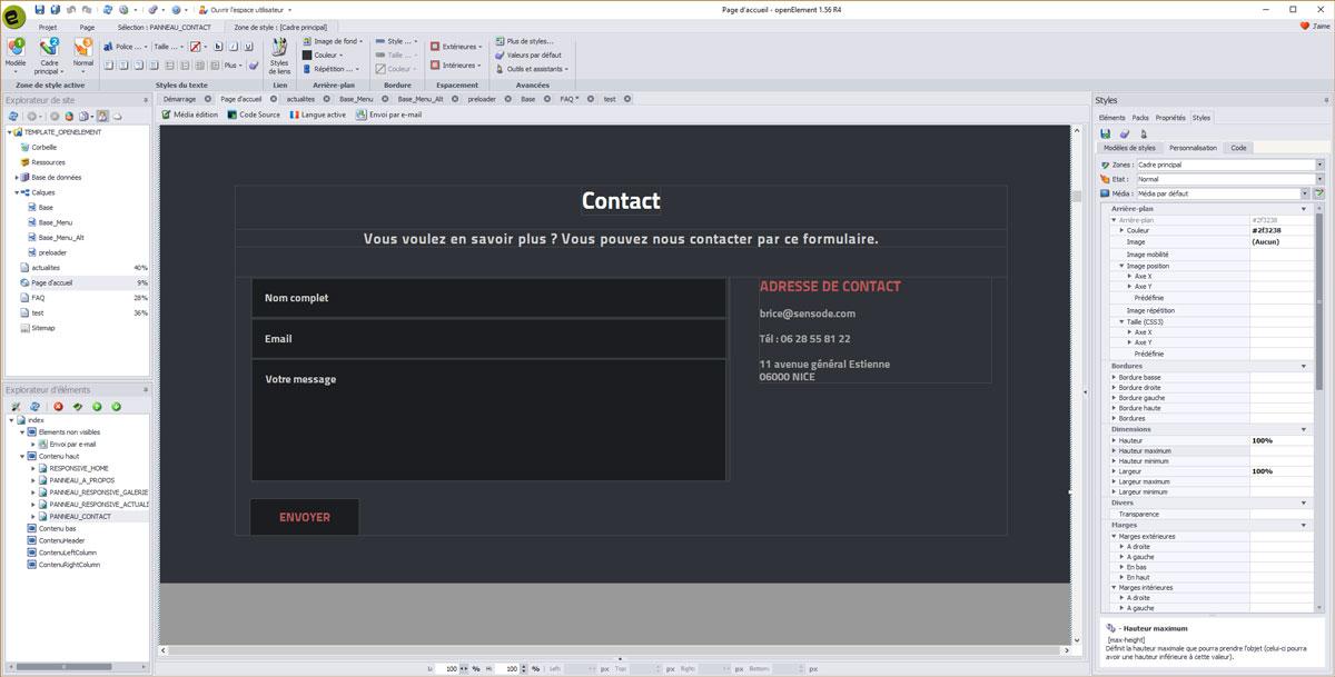 Comme vous pouvez le voir, le template SENSBLACK comporte de tous nouveaux éléments ainsi que du code spécialement développé et intégré au mieux dans openElement.