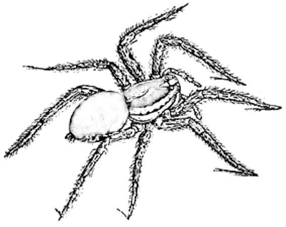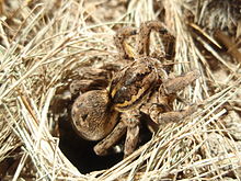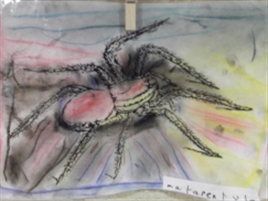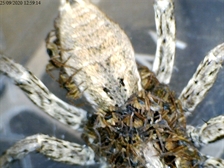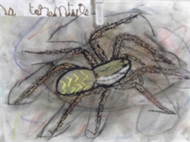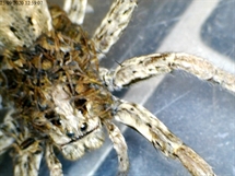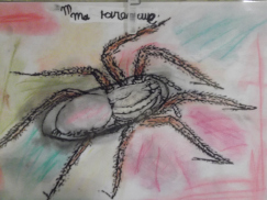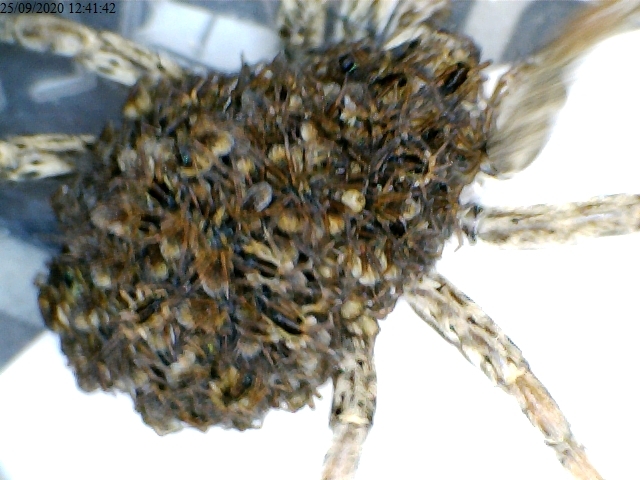 La tarentule pond ses œufs sur une petite toile, elle en fait un sac et le place sur son abdomen. (Mélina, Donovan)