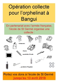Un projet de collecte en partenariat avec les armées françaises et l'Union européenne monté et géré par la communauté éducative de Saint-Germé. Un mois de travail pour une grande réussite. C'est au début du mois d'avril que le commissaire principal Hakim El Safty, des armées françaises, en opération extérieure à Bangui (capitale de la République centrafricaine) dans le cadre d'une mission de l'Union européenne pour la formation des cadres de l'armée nationale et également parent d'élèves dans les écoles de Saint-Mont et de Saint-Germé a pris contact avec les enseignants par le biais d'un courriel très émouvant. Il y expliquait le dénuement extrême et la situation très difficile de l'orphelinat Yambamby-Mbingazo-SaintCharles de Bangui.